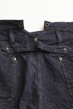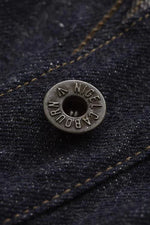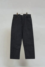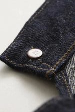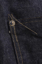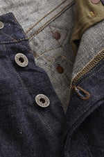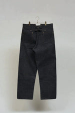 1920年代にフランスのレイルマンたちが着用していたヴィンテージ・デニムをベースにしたデザインで、深い股上と幅広のワタリによる迫力あるシルエットが特徴です。 ヴィンテージ・デニムを徹底解析し、現代に蘇らせたブランド・オリジナルのスペシャル・ファブリックを使用しています。縦方向にみられる明らかに普通のデニムとは異なる複雑で豊かな凸凹は、タテ糸に異なる3種類の太さの糸をランダムに配置している事からきています。大戦下の物資不足が背景にあり、太さの違う糸を端から順に配置し織り上げた、決して通常では行なわれない織上げ方法です。大戦下に生まれ、大量生産の波に飲まれてほんのわずかな期間しか存在しなかった幻のようなデニムです。