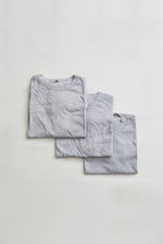 Tシャツはとてもシンプルなアイテムであり、製品もピンからキリまで世の中に溢れています。毎日着用する事も多いので同じものの3枚パック、色違いの3枚パックなども売られています。そこで私たちも3枚パックのTシャツを開発する事にしました、私たちの製品のほとんどはオリジナルのファブリックを使用し、ファブリックの基になる糸そのものが既存品で目的にかなわない場合は、糸造りからスタートするケースが珍しくありません。