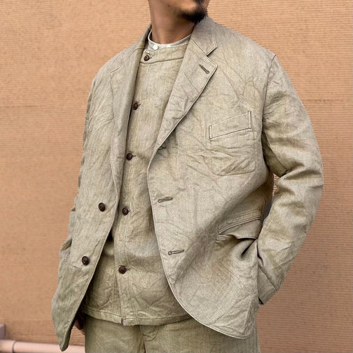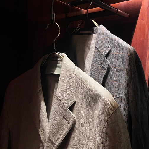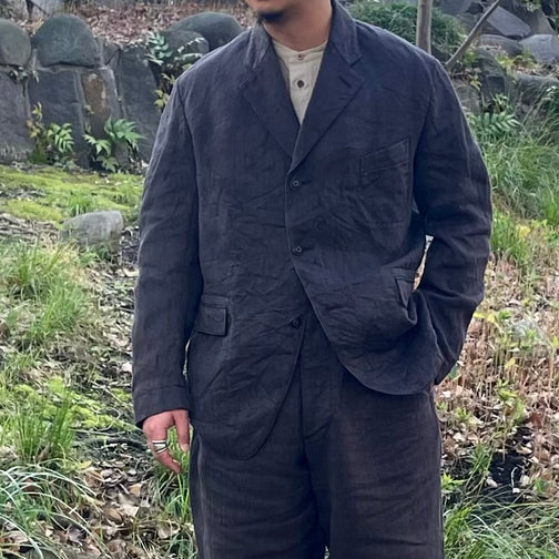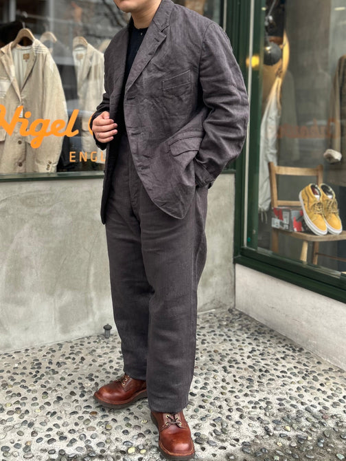カーキはヘンプとリネンのリンボーンツイル。チャコールはヘンプ100%のヘリンボーンツイル。