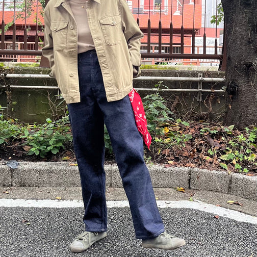 12.5ozのデニム地で穿く度に身体に馴染みます。程よいテーパードシルエットがとても綺麗なラインのパンツです。サイズ選びは敢えて大き目などにせずに適性サイズが推奨です。身長~160cmの方にはサイズ6、160~165cmの方にはサイズ8、それ以上の方にはサイズ10がオススメです。