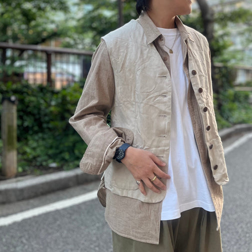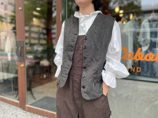 1930年代紳士用のベストがデザインモチーフのクラシックなデザインです。新型の LARGISH BLAZERと合うように仕立てています。ゆとりのあるラフなシ ルエットのベストは、同素材のワークパンツとのセットアップやワンピースなど様々なアイテムと相性良くご着用いただけます。