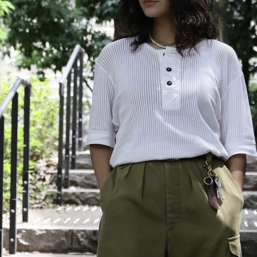 サンスペルのアーカイブにある類似品をベースにしたヘンリーTシャツ。スーピマコットンメッシュを使用し、ミリタリーテイストを醸し出しています。製品染め加工で柔らかな風合いに仕上げ、ナイジェル・ケーボンの代表的なアローヘッドボタンが付いています。ゆったりとした気楽なシルエットで着心地も抜群です。一枚でも重ね着でもお楽しみいただけます。