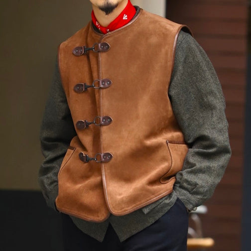 シェルパが着用したヴィンテージベストをベースにしたデザイン。素材はカウのベロア。パイピングレザーはクロムとタンニンのハイブリッドなめしを施したホースハイド。