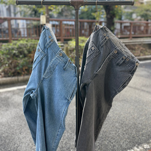 1940年代のイギリス軍のバトルドレスをモチーフにしたデニムパンツです。ジャケットと連結するための高めのウエスト位置や、ベルトループ、座った姿勢でもすぐに物を取り出しやすいポケット位置や収納力を高めるポケットのディテールなど、ヴィンテージのディテールを最大限に残しながら、ウエストから裾にかけてストレートに落ちる履きやすいシルエットにアップデートしました。12オンスのデニムに、バイオストーンブリーチの製品加工を施しています。バトルドレスジャケットと合わせてセットアップとしても、ブラウスやカットソーに合わせても着用できる、コーディネイトの幅が広がるアイテムです。