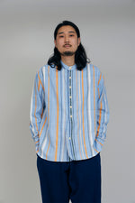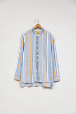 スタンドカラーシャツ。1つのボタンで固定された下側の延長ラップオーバー、ダブルボタンの幅広の袖口、肩の特徴的な縫い目等、シンプルながらキャラクターのある一着です。