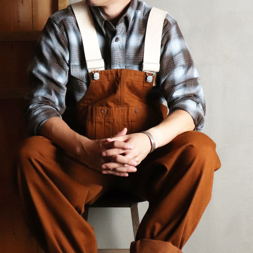 鉄道労働者のウェアから着想されたデザインです。ワークウェアスタイルのオーバーオールである本アイテムは、厚手のツイル素材で、リラックスしたフィット感+脚はストレートシルエットでデザインされています。胸のスプリットパッチポケット、太ももの2つの大きなカーペンタースタイルポケット、コントラストのあるストラップが特徴です。バータックがポケットの端の周りに縫い付けられ、耐久性を高めます。