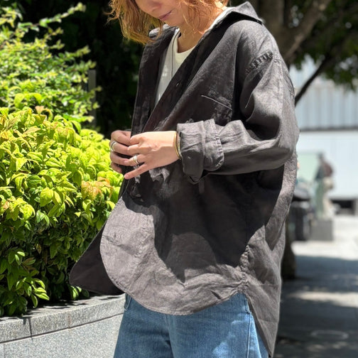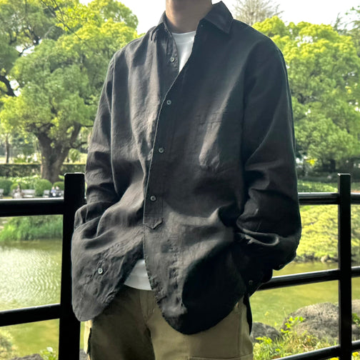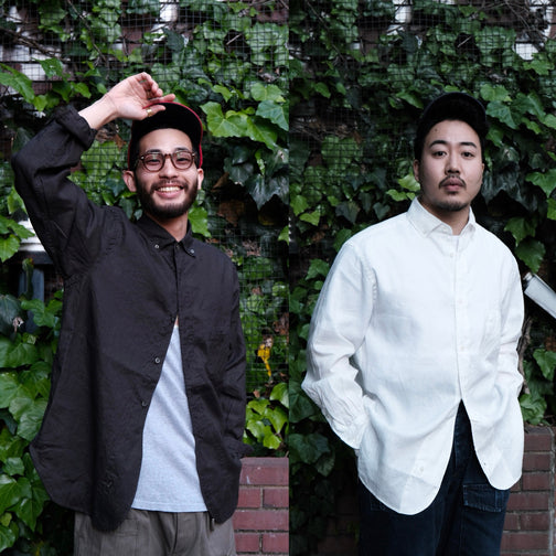 ヘンプポプリンのブリティッシュオフィサーズシャツ。ポプリンの由来はアイリッシュ・ポプリン。アイルランドで製織されたシルクとウールの伝統的な交織生地ですが、現代では単純に平織り薄地の生地の総称となっています。デザインはおなじみのブリティッシュ・オフィサーズシャツ。パンツにタックインしたシャツの裾が激しい運動でも飛び出さないように良く考えられたデザインです。