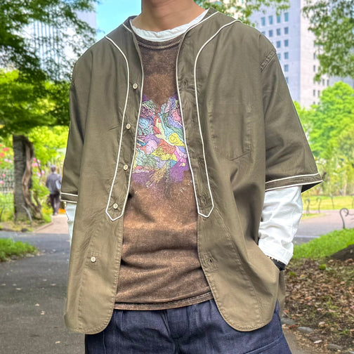 コットンツイルのベースボールシャツ。立体的に立ち上がった襟の構造が特徴。
