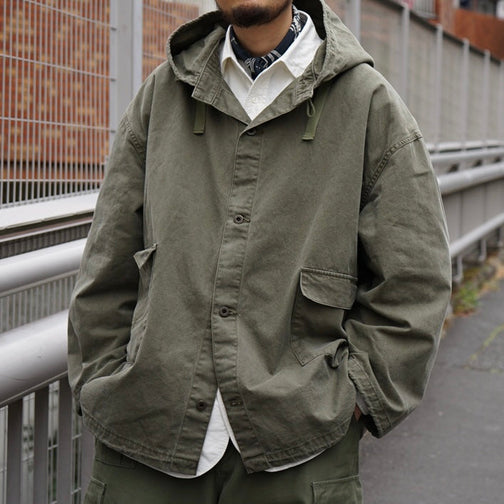 デザインは所謂ガンナースモック。艦砲、あるいは陸上砲台において、自動装填装置を含めた全自動射撃管制システムの発展前には砲の操作には人力が不可欠でした。炸薬によるガスや熱風を避けるため頭部を完全に覆うフードと特に喉元をしっかりカバーするよう考慮されています。完全に体を覆うと共に、なるだけ衣服のひっかかりを排除する目的からスモックタイプになっている事も大きな特徴です。一方で、フィールドジャケット等と比較するとガンナースモックの全体は非常にシンプルです。頑丈な前者と比べれば、やや華奢な感じすらします。理由はガンナーの居場所が砲台の中であるから。 そのため風雨や気温差、瓦礫やジャングルなどの環境に対向するディテールは必要ありません。その代わり砲台内ならではの過酷な状況にのみ特化して対応するよう設計されています。ファブリックはピグメントのピースダイ。顔料の反染めです。顔料染めならではの経年変化を楽しむ事ができます。