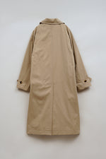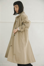 なだらかなラグランスリーブと、トレンチコートのようにゆとりを持たせた身頃が特徴で、肌に馴染むような軽やかな着心地です。