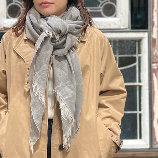 極細のウール糸で織り上げたストールを作りました。大判の正方形で、ジャケットやワンピースなど様々なアイテムに合わせて着用いただけます。両端にフリンジを施した、軽く柔らかい透け感のあるストールです。