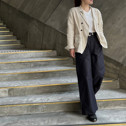 高密度リネンを採用したダブルブレストジャケットです。素材は、高品質のリネンを撚った40番単糸を用い、極めて高密度に織り上げたオリジナルファブリックです。織りあがった生地を、晒(さらし)にかけ、リネンに含まれるペクチン(糊状の物質)を適度に取り除くことで、他にはない光沢と弾力が生まれ、着込むほどに高級感のある風合いに変化します。新色は、ヴィンテージリネンのように長く着込んだようなくすみのあるダスティーホワイト。デザインは1920〜30年代のフレンチワークより着想した、2024年秋冬のジェントルマンダブルブレストジャケットと同じパターンです。 それに加えて、リネンローンの半袖裏や、半裏と本ワタ毛芯で仕立てた肩パットユキワタを用いた、2023年春夏以前のていねいな仕立てを採用しました。 最上級の素材と細部まで手仕事で仕上げた、Nigel Cabourn WOMANらしい夏のジャケットです。