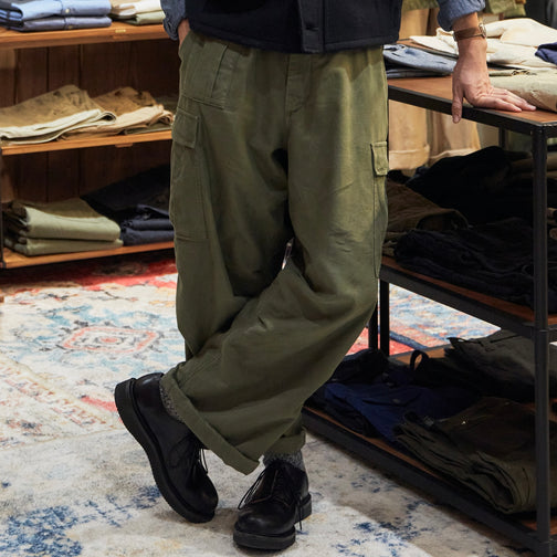 米軍のM-43と、カーゴパンツの傑作M-51、そして英国陸軍のビンテージをミックスしたデザインです。ファブリックはバックサテン。非常に剛性の高い組織です。素材はM-51同様にコットン100%。
