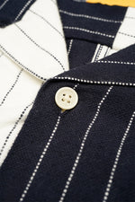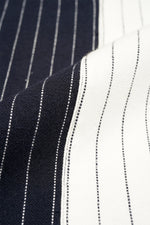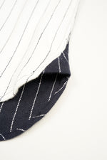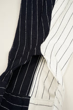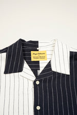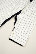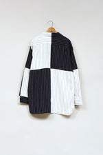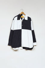 オーバーサイズなプルオーバーシャツは二種類の対照的なストライプコットンオックスフォード生地で作られており、切り返しのデザインによってチェッカーボード柄になっています。
