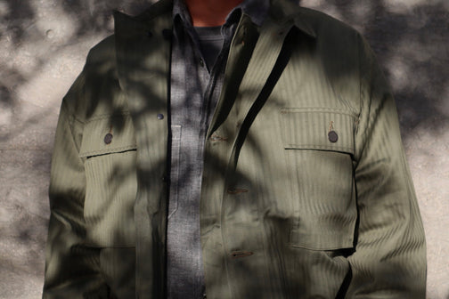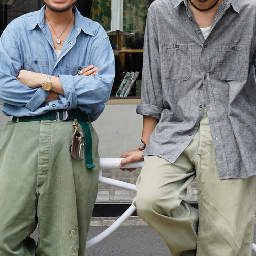 HANK DYENING、日本語では「かせ染め」。かせとはかせ枠に一定量の糸(糸の種類によりヤード単位で規定された量)を並行に引きそろえて巻き取ったものです。糸を緩く並行に束ねた様子を想像してもらうと判りやすいかもしれません。この状態で染色すると糸はテンションが掛かってにないためナチュラルな状態で染料が芯まで良く浸透し、引っ張られていない自然の状態のまま染色される事から結果染上がった糸はふんわりと柔らかい風合いにある事が特徴です。 このかせ染と対照的な染めが「チーズ染色」文字通り円筒形のチーズの形状に糸を巻き取り中心と外周で染料を循環させ染色させます。早く効率的に染める事ができますが、チーズ状にしっかり巻き付けられた糸には当然テンションがかかりますので、相応の表情になります。 デザインはヴィンテージのUSネイビーシャツです。