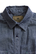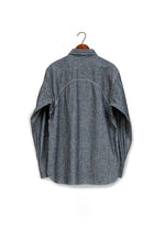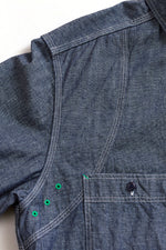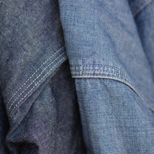 一般的なシャツは背ヨークの部分のみが2枚の生地が重なっていますが、本製品はアームホール全周から肩、背にかけて生地が2枚重ねになった特徴的な構造になっています。こうして上半身で最も運動量の大きい両腕を中心とした部分ががっちり補強されている訳です。