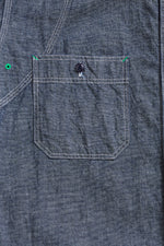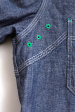 ボタンは堅い椰子の実を加工したキャッツアイを使用しています。その名の通り、猫の目のように中央部分に鋭く切り込みが入っています。この切り込みの溝の部分に糸が沈むようになっており、糸切れによるボタンの脱落を防ぐディティールです。