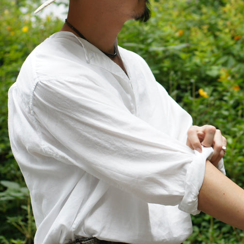 夏のワーカーのためにデザインされたワークシャツ。最大のポイントは夏に相応しい軽やかなシャツをロールアップできるような、あらたな袖の設計が施されていること。通常のシャツ袖はアームホールから手首に向かって急速に筒が細くなり、袖口にはカフスが付きます。このカフスとソデを破綻なく繋ぐパーツとして、剣ボロがセットされています。長袖として着用した際に最も機能的に着用しやすいデザインであるとも言えるでしょう。これら通常のシャツに対して今シーズのシャツは新たな設計に置き換えています。 新設計のポイントは、1900年代初頭の英国ヴィンテージワークウェアの袖の構造を参照したこと。ベースになったヴィンテージの筒袖は袖口幅が充分が充分確保されています。当然のそのままですと手首がブカブカになりますのでカフスパーツを付け、手首側で強引に袖幅を絞る工夫が施されています。これはとりもなおさず、ロールアップしやすいように、またロールアップした際に腕を必要以上に締め付けず作業がいやすいよう考慮されたデザインです。