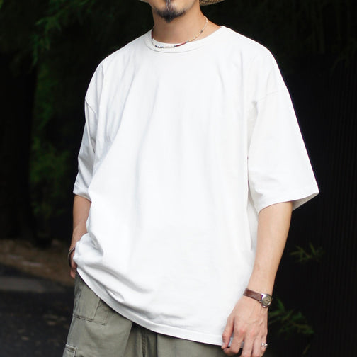 Tシャツの襟には脱ぎ着がしやすいように、また洗濯などですぐに伸びきったりしないように、見頃生地の天竺編地とは異なる、伸縮性のあるフライス編地等がセットされています。 この襟パーツは身頃へのセットの仕方によりおおまかに二種類あります。オーバロックネックとバインダーネックです。前者は襟と身頃を内側に織り込んでロックミシンで固定します。後者は襟パーツを二つ折りにして身頃を挟みこんで固定します。一般的には後者の方が頑丈です。頑丈な後者に更にフライスの別パーツを挟みこんでより強固にしたものが本製品の仕様であるダブルバインダーです。長年の着用や繰り返しの洗濯に良く耐えると言う事の他、このパーツが汗を吸うので、見頃への影響をある程度は抑える汗留めとしても機能します。