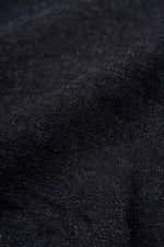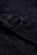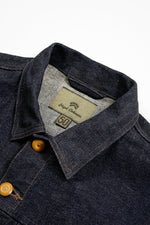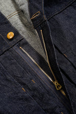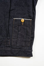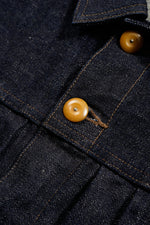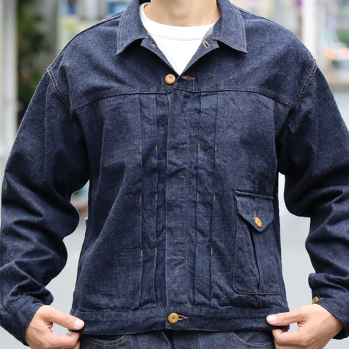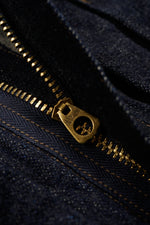 1940年代のデニムジャケットをベースにしたデザインです。前身頃の上端にひとつのボタンがありその下からファスナーが走り、一番下の端にもうひとつのボタンがセットされています。これは当時のファスナーの仕様から必要とされたデザインでした。ファスナーはエレメントにスライダーを滑らせて開閉します。初期のファスナーのスライダーはエレメントを合わせる主目的だけの機能しかなかったので、ファスナーが閉じていてもその左右の布を引っ張るとズルズルとファスナーが開いてしまう事がありました。そこでスライダーが進化して通常はスライダーに内蔵された小さな爪がエレメントに引っかかって固定し、スライダーの引手を引っ張れば爪も浮いてロックが解除され自由に動く構造に進化しました。本製品は進化前のファスナーを使用していますので特に上端のボタンはベースとしたヴィンテージ同様の重要な機能を持ちます。