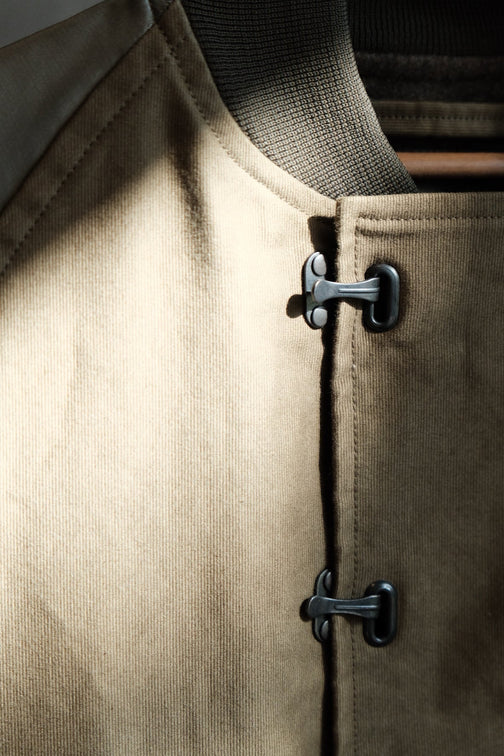 MA-1と40年代のUSクリップジャケットを組み合わせたデザインです。米海軍がデッキジャケットに用いたことからそう呼ばれるクリップは片手で素早く、たとえ暗闇でも解放して脱ぎ捨てる事が出来るため常に沈没の危険を考慮すべき、特に戦闘艦にはうってつけの仕様でした。片手、グローブという共通の要素から消防士の防火コートにも転用され、ファイヤーマンクリップの異名も有ります。時代を遡れば、これらの発生のはるか以前、第1時大戦の英国陸軍にたどり着きます。第1時大戦の特に初頭は歩兵どうしの肉弾戦がすなわち戦闘でした。その中で最も強力な手段は歩兵による一斉突撃でした。そのために前線に強大な塹壕を掘り、兵士はその中で食事をし眠り、塹壕を掘り進め、そして突撃していったのです。前線となった欧州北部を上空から俯瞰すれば、巨大で長い塹壕がうねうねとのたくりながら、まるでそれそのものが意思を持つかのように海を目指して伸びていくようでした。第1次大戦がすなわち塹壕戦と呼ばれ、また別命を「海へのレース」と呼称された所以です。こうした塹壕戦で英国陸軍兵士が運用した、まるで着用するテントのように分厚く重く頑丈なコートを固定していたパーツこそが、本製品のクリップパーツです。
