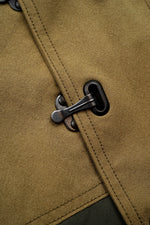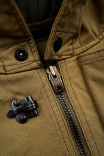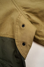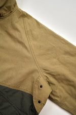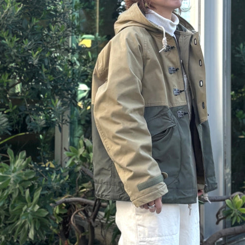 ヴィンテージのデッキジャケットをベースに、異なる要素を巧みに組み合わせたデザインです。身頃上部には独特の風合いを持つハーフテックス、下部には形状安定性に優れた特殊ポリエステルを使用したコンビネーション仕様。素材の表情や機能性の違いが際立ち、古き良きミリタリーデザインに現代的なエッセンスを加えた一着に仕上がっています。さらにフードと裾にはドローコードを配し、シルエット調整や防風性の向上にも配慮されています。