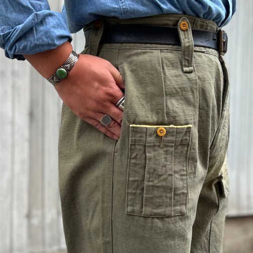 1940年代のブリティッシュ・アーミーのバトルドレスパンツをベースに、1960年代のローデシア軍のバトルドレスパンツの要素をドッキングさせて、日本の生活様式に合うようにアレンジしました。 特徴的なのは、ベルトループ。本来はピストルベルト用とされていたベルトループの向きを逆にして、より使いやすく機能的に変換しています。またベルト裏の仕様は1940年代のオフィサーズパンツの仕立てを分析し採用することによって、デザイン元はファティーグパンツの域でしたがオフィサーパンツの域まで昇格し価値転換しています。
