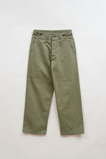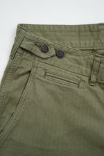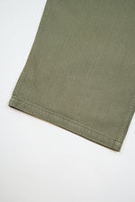 米国陸軍で1943年に制式採用されたM43パンツをベースに、ブランドオリジナルのSZヘリンボーン生地を使用した仙台店別注モデル。強度に優れた特殊織りの生地は、ナイジェル・ケーボン氏が発見した希少なヴィンテージをもとに再現しています。カーゴポケットを省いたシンプルな仕様に、アジャスターやシンチバックで快適な着用感を実現。さらに、ヒップポケットには珍しいステンシルプリントを施したスペシャルな一本です。
