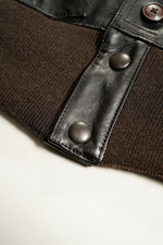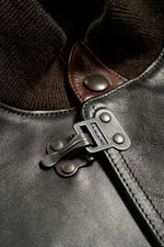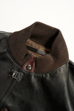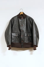 茶芯のホースハイド。皮はそのままでは硬化したり腐敗したりしますが「なめす」事で皮は革に生まれ変わります。人類の最も原初的なその作業は一説ではエスキモーがアザラシの皮を噛んで唾液で柔らかくした事だとの説もあります。近年では関雄由来のクロム溶剤でなめす肯定が一般的ですが、本製品は100%天然由来のタンニンなめし。フルにタンニンを使用するので「フルタン」とも。茶芯なので使いこむにしたがってブラックの下のブラウンが徐々に顔を出します。着用者自身の着方や癖を反映した経年変化が生じるため、そのオーナーだけの唯一無二の一着に仕上がります。デザインはA-1初期型と後の民生品のディティールをアレンジ。