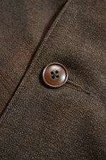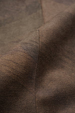 日本の最新技術を駆使した合繊スウェード生地にカモフラージュプリントを施しました。一般的に原反(げんたん/ファブリック)にプリントをする場合は柄のカタチに孔を切り抜いたシルクスクリーンをファブリックの上に置き上から染料を塗布する事で、柄の形に色を載せる方法があります。「版」を使う、という意味では木版や銅版と同じですが、厳密には木版は凸番、銅板は凹版、リトグラフは平版でありシルクスクリーンは孔版です。何れも「版」を使いその使い方でそれぞれの特徴が生じます。これら一連の手法と根本的に異なるのがインクジェットプリントです。版を必要としない方法で、紙にカラー印刷する様子を想像して貰うと判りやすいでしょう。本製品は、カモフラージュの柄を別のファブリックにインクジェットプリントしそのファブリックをストーンウオッシュと手作業による加工を施します。そうして完成したファブリックの画像を印刷機のデータとして取り込み、本製品のファブリックにインクジェットプリントをして完成させています。