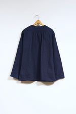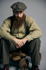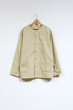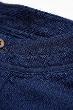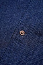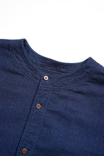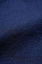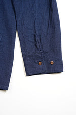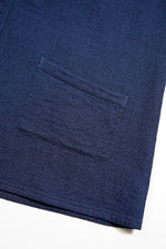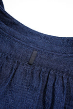 1900年代の初期の農園労働者が着用したシャツ。現代のベストの起源である袖付き形状を再現。モデルとなったヴィンテージウェアの時代、シャツというアイテムは現代の下着と同様の感覚で着用されていました。シャツの前身頃と後身頃の裾が長いのは下着のパンツ替わりの役割を持たせたから。従ってシャツ1名で表に出あるく事は下着で歩く事と同じでした。そこで下着の上着としてベストが誕生しました。上着なので袖が付いていましたが、その上にジャケットを着用するので、ベストの袖は徐々に省略されて行きました。本製品はベストの黎明期のクラシカルな形状を現代に蘇らせています。ファブリックはインディゴのダブルフェイス、所謂二重織です。