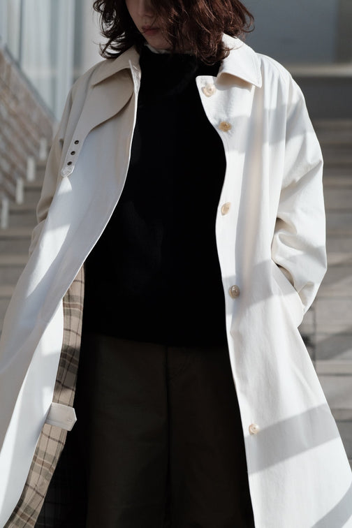 なだらかなラグランスリーブと、トレンチコートのようにゆとりを持たせた身頃が特徴で、肌に馴染むような軽やかな着心地です。