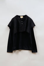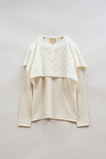 イギリスの歴史あるレースの柄をアルパカウールで表現したケープに、上質なウール天竺のロングスリーブTシャツを組み合わせたセットアイテム。ケープは取り外し可能なデザインで、それぞれ単品でも着用できます。
