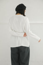 肩まわりの可動域を広げるフリーダムスリーブ仕様で、動きやすくリラックスした着心地に。 後ろ丈をやや長めにデザインしているため、前だけをボトムにタックインしてももたつかず、裾を出してもバランスよく着られるシルエットです。
