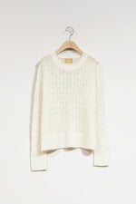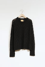 レースのように繊細な模様とほのかな透け感が魅力の、柔らかくなめらかな薄手のセーターです。