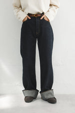 ユニセックスな腰履きとは一線を画す、あえてのジャストウエスト仕様。ウエストをしっかりとホールドすることで、クラシックなフォルムと女性らしさを際立たせます。 存在感のある10cm幅のワイドロールアップが、タフなムードに洗練を添え、上質で芯のある佇まいを演出します。