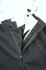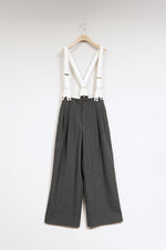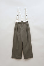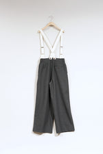 ヒップから裾までゆとりを持たせた、程よくリラックス感のあるシルエットが特徴。付属のサスペンダーは取り外し可能で、スタイリングに合わせて表情を変えられます。シックで落ち着いた印象の一本です。