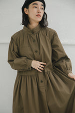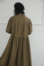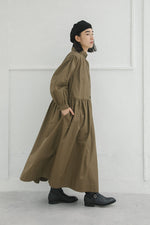 生地には、しっとりとした重みと上品な光沢を持つコットンギャバジンを使用。動くたびにスカートがふんわりと広がり、日常の装いに自然な存在感を与えてくれます。