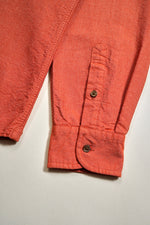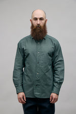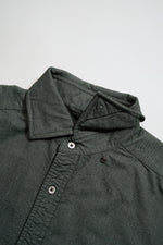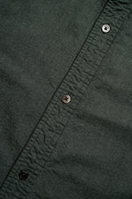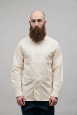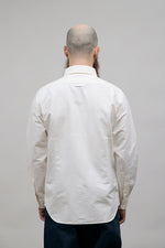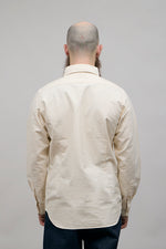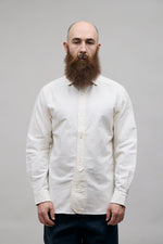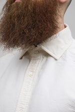 別注生地では飽き足らず、糸を構成するコットン短繊維の選定とブレンドから着手。紡績工程を経てオリジナルで糸づくりを行い、その緯糸を用いて織り上げた、ナイジェル・ケーボンを代表する定番シャツです。