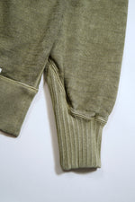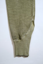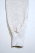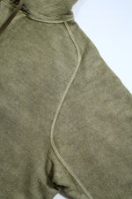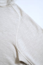 生地を織り上げたり編地を編む際には糸に対しテンションをかけます。一般的に生産のスピードを上げるほどにテンションを強く掛ける事になります。引っ張られた状態で成型された生地や編地はしばらくはその形をとどめますが着用と洗濯を繰り返すうちに元の形状に戻ろうとします。洋服がランダムな方向に型崩れする原因のひとつがこれです。 ナイジェル・ケーボンの製品が撚糸や製織、編み地にとことんこだわるのは、店頭にある状態がベストでなく、長く着用を繰りかえしていただいた状態をベストとしたいからに他なりません。