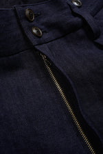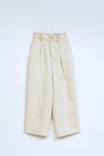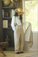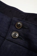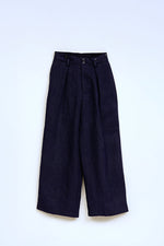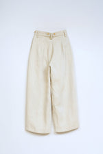 イギリス由来のインタックを取り入れ、ワイドシルエットでありながらすっきりとしたラインに仕上げています。ウエストは適度にフィットし、サスペンダーでの着用にも対応する汎用性の高い一本です。