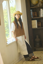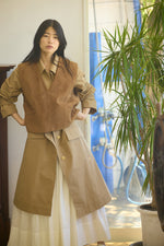 細く長く設計されたVネックが、マニッシュな佇まいの中に、女性らしいシャープさを添えます。バックスタイルにはウエストマークの切り替えを施し、一枚で着用しても美しいシルエットに仕上げています。
