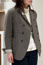 DBジャケットはフロントのカーブがとても綺麗なので、ボタンは留めずに羽織る着方がほとんどです。中に仕込んだエプロンもきちんと見えますよね。