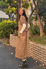 全体的にカーキカラーで統一し、ベストをレイヤードすることで単調なスタイリングにならないようにしました。