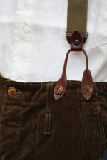 深い股上を埋めるようにサスペンダーで吊るすと、驚くほど綺麗なシルエットに収まり、レザーとホーンボタンが腰回りに絶妙なアクセントを加えてくれます。